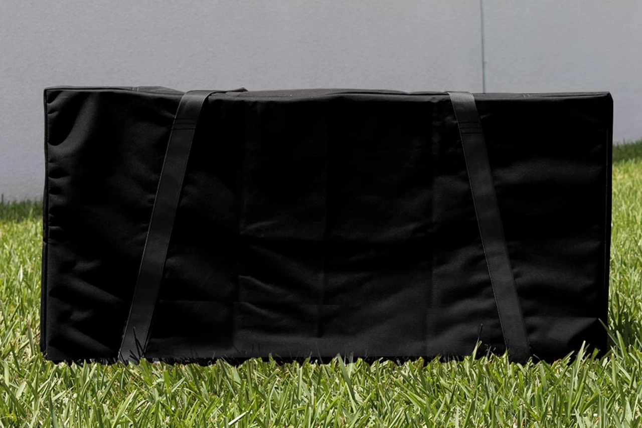 Store and carry your full sized 24×48 cornhole sets in our heavy duty, high quality cornhole carrying case which also doubles as a storage bag. Made of high quality, durable PVC-backed weather resistant canvas materials, strong triple stitched 60″ nylon carrying straps, and quality zippers, you can finally store and protect your cornhole set with ease. We use the same material many luggage manufacturers use! This case is large enough to store two full size 24×48 cornhole boards that use 2×4 (or smaller) frames with folding legs and your accessories. Another unique feature of our exclusive case is that it’s easy to load. Even one person can do it! Just set your boards on their end and pull the case over one end and pull down. Set them down, zip up the end, and your done!