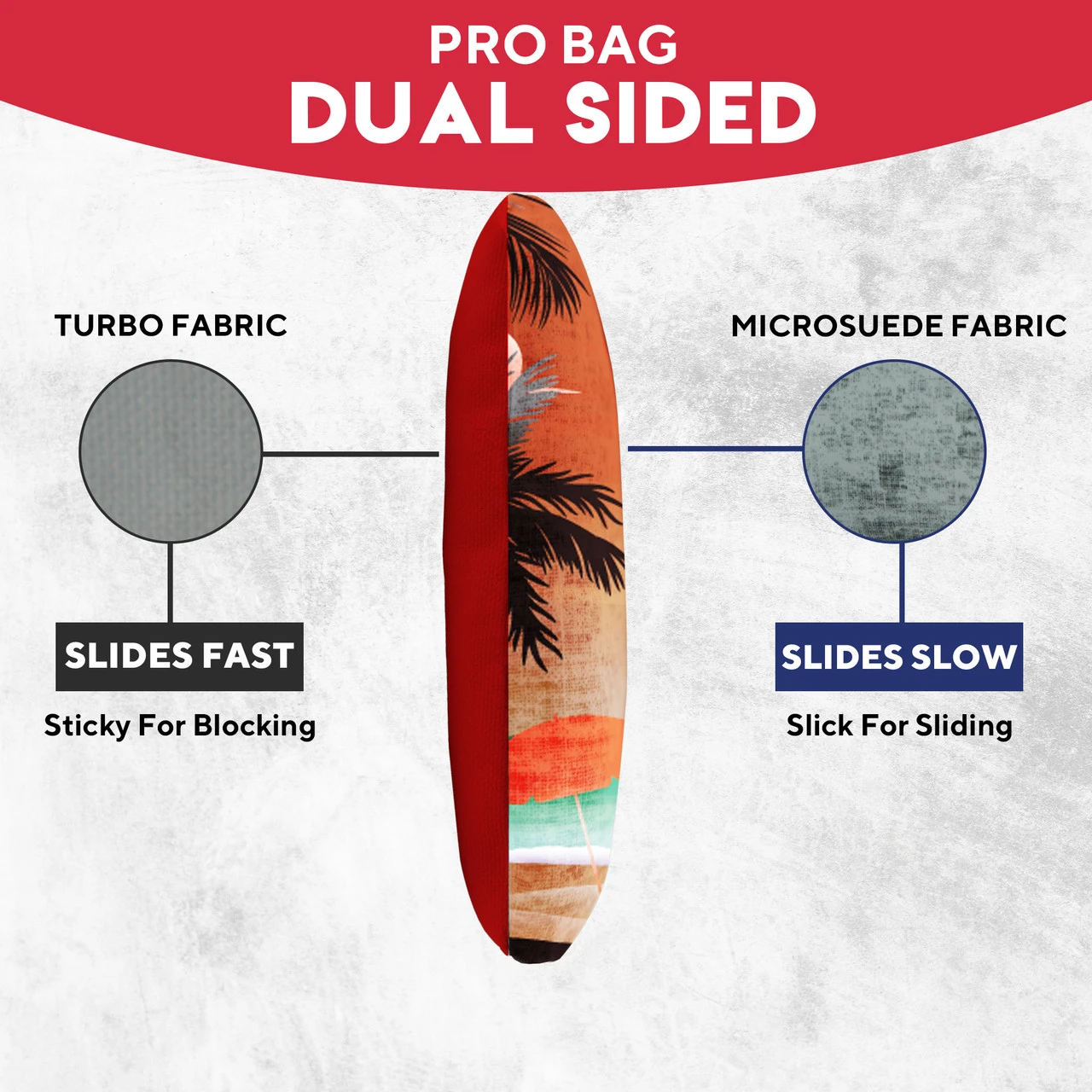 Professional Regulation Cornhole Bags’ dual-sided material construction advances playing strategy and control, allowing you to grab or glide on the board. With various graphic options available, sets can be mixed and matched to fit any style.
